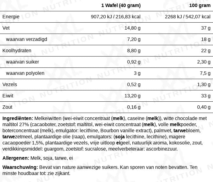 Eindelijk is er een wafel verkrijgbaar die door fanatieke sporters gebruikt kan worden. Dankzij de hoge hoeveelheid eiwitten past het binnen ieders voedingspatroon. Deze wafels bevatten maar liefst 30% eiwitten en 10 gram koolhydraten. De lekkere crèmevulling is in twee lagen opgebouwd en de wafels zijn overgoten met heerlijke, knapperige Belgische chocolade. Delicious Protein Wafel kan gebruikt worden als gezond tussendoortje!